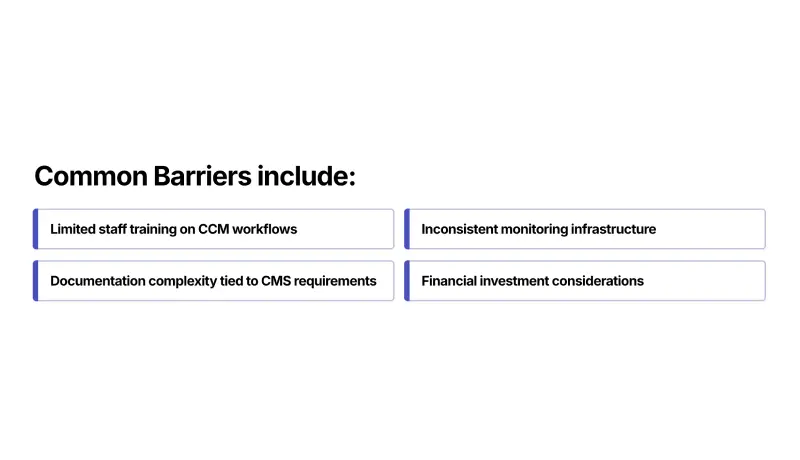 Facilities that address these challenges through leadership engagement, staff education, and technology integration are more likely to achieve successful CCM outcomes.